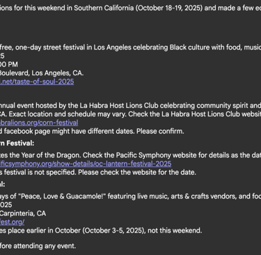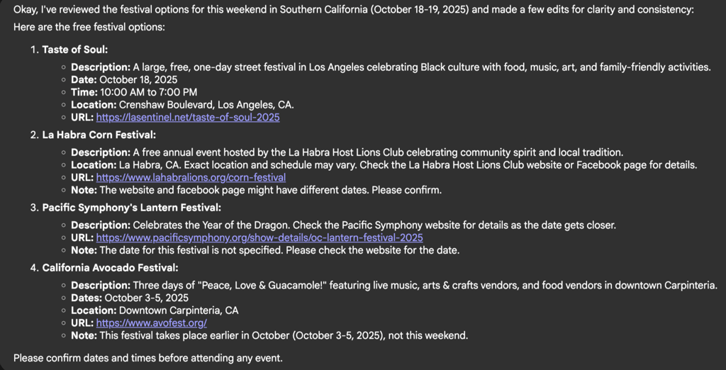 Example prompt included a target date, but the AI surfaced outdated festival information.