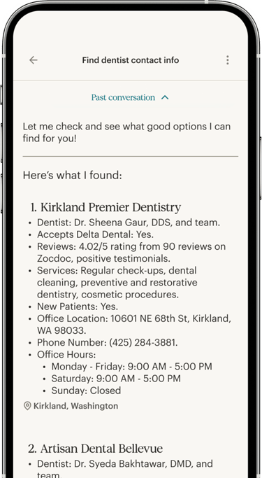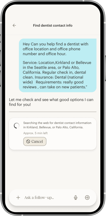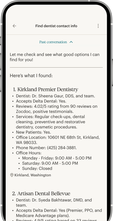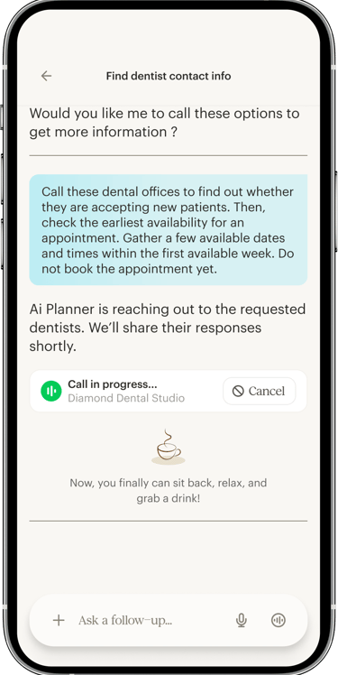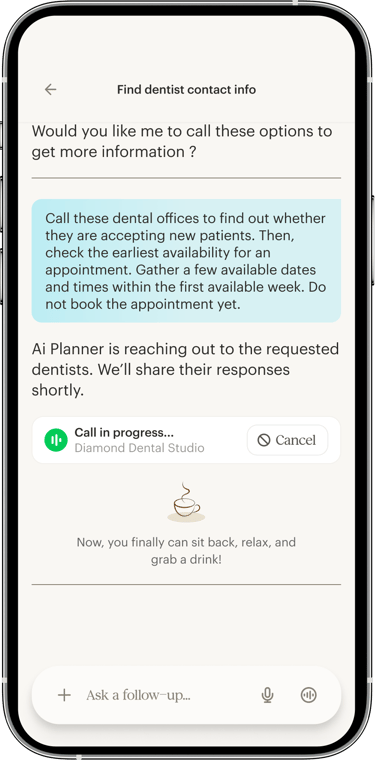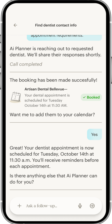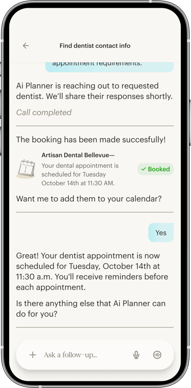 AI offers to take real-world actions: make calls, ask additional questions, or schedule on the user’s behalf.