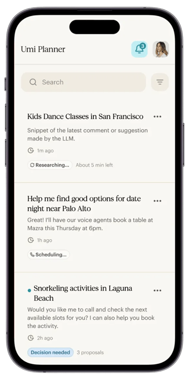 All requests are tracked in home page, showing their status: researching, scheduling, or waiting for user input if additional information is needed to complete a task.