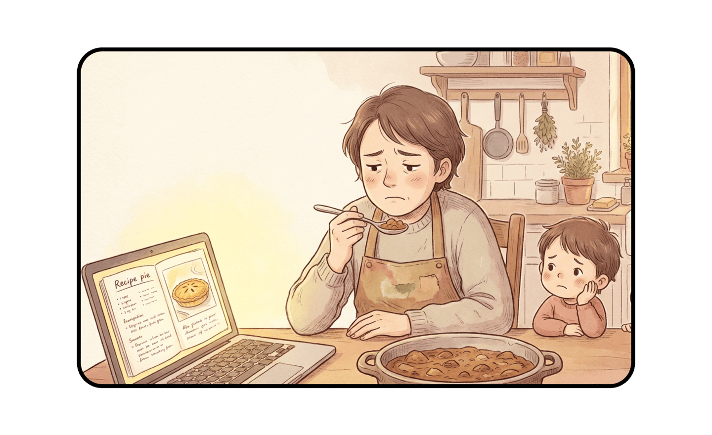 She tastes a dish she prepared from an online recipe, concerned it might not turn out well. Finding trusted recipe sources is challenging, and achieving reliable, tasty results requires extra care.
