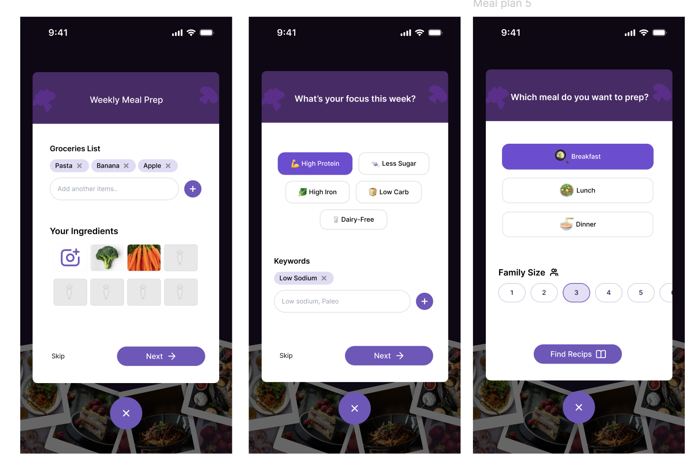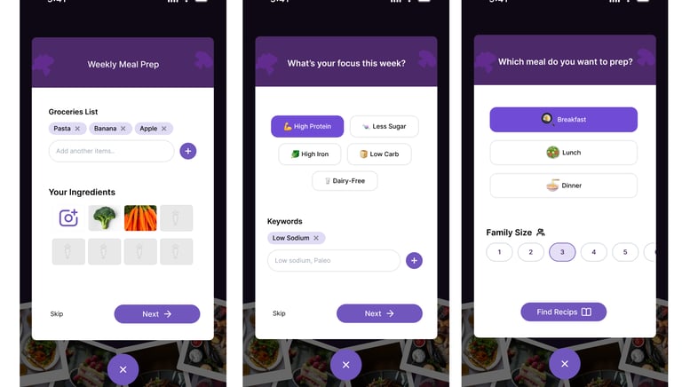 After speaking with target users, the design was updated to reflect their needs, including shopping lists, ingredient images, and recipe customization options. Rather than making weekly meal prep a separate pop-up, we decided it should appear directly whenever users access the camera in the app.