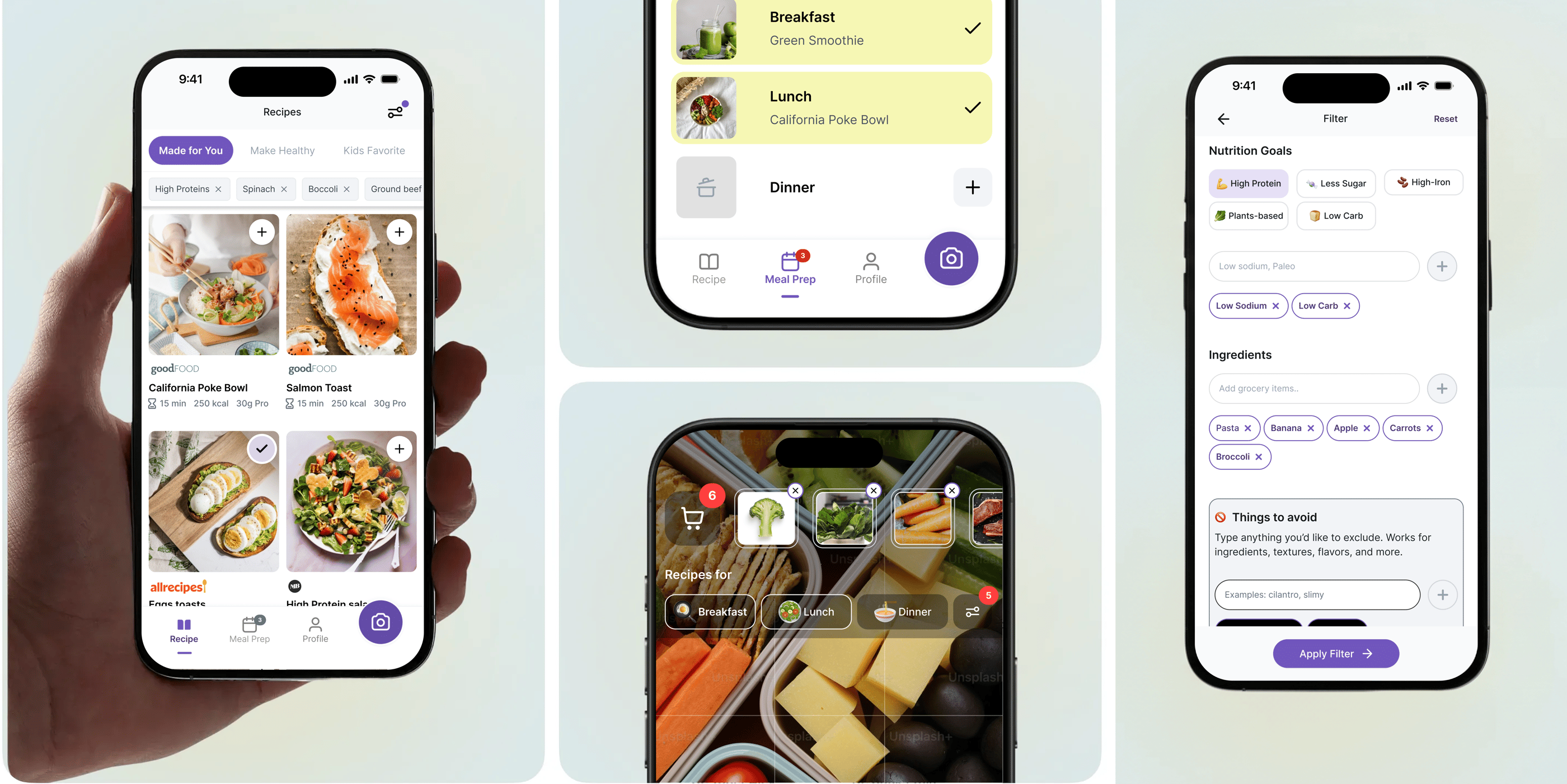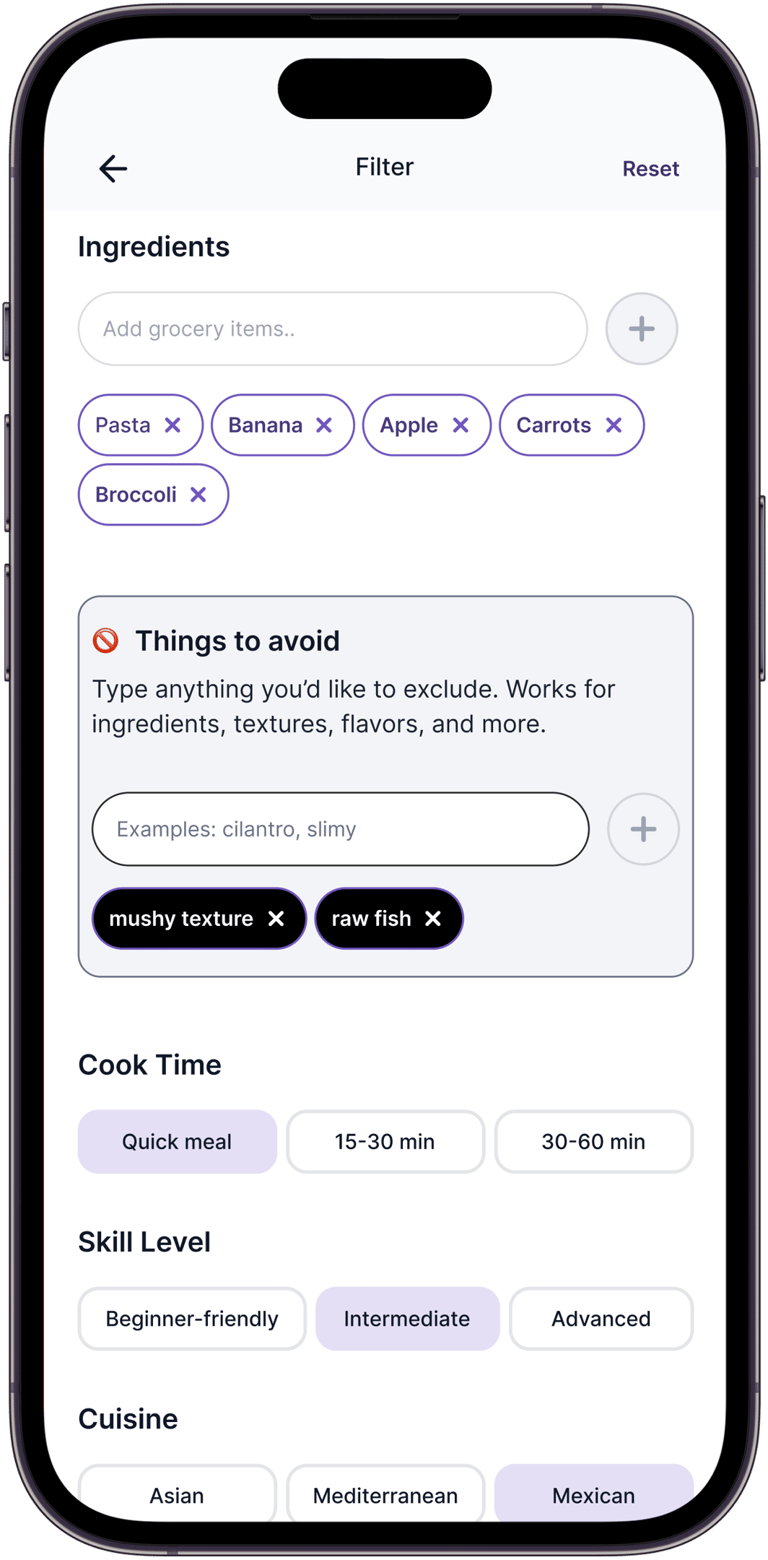 Users can filter recipes by what they want or need to avoid, a feature users valued highly in research.