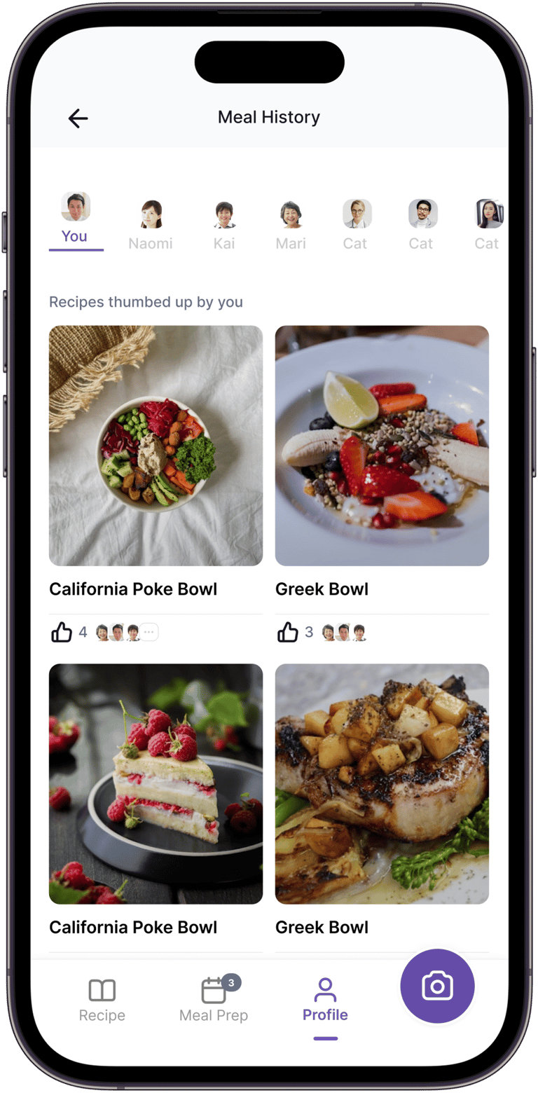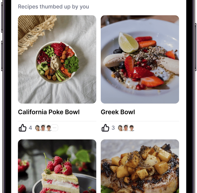 Users can thumbs up or down recipes, saving likes to their meal history.