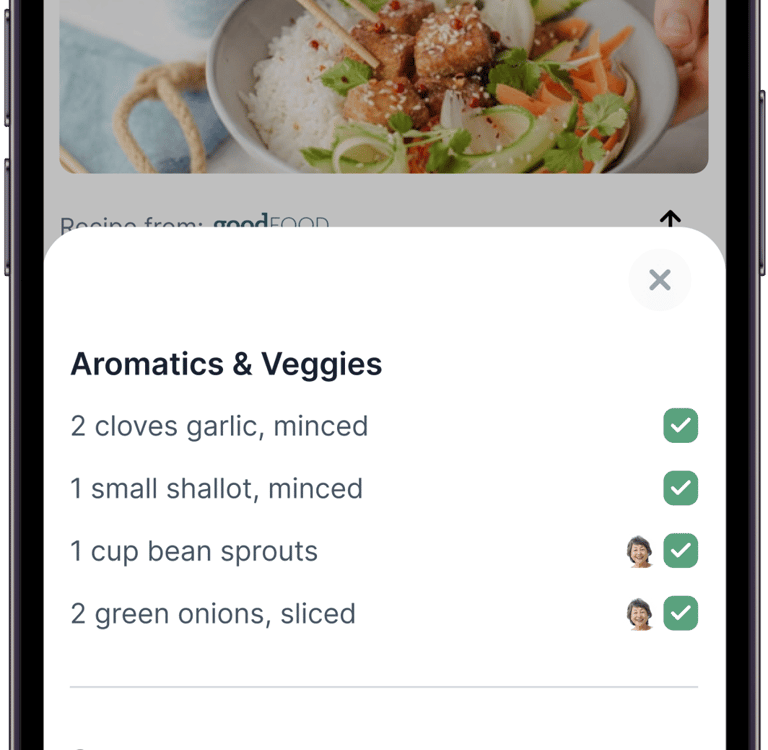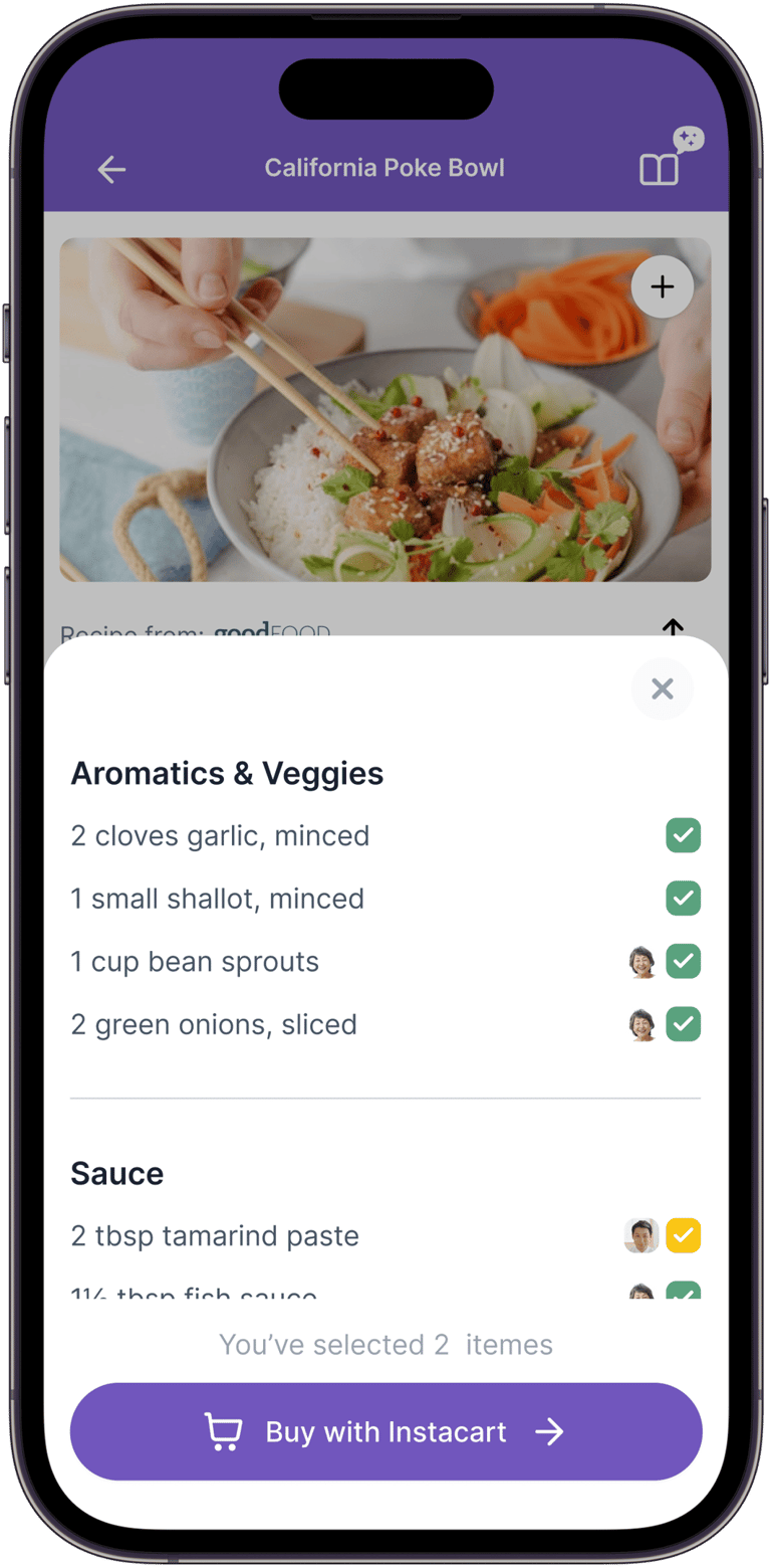 Users can check off ingredients, see who’s bringing what, or buy missing items via Instacart.