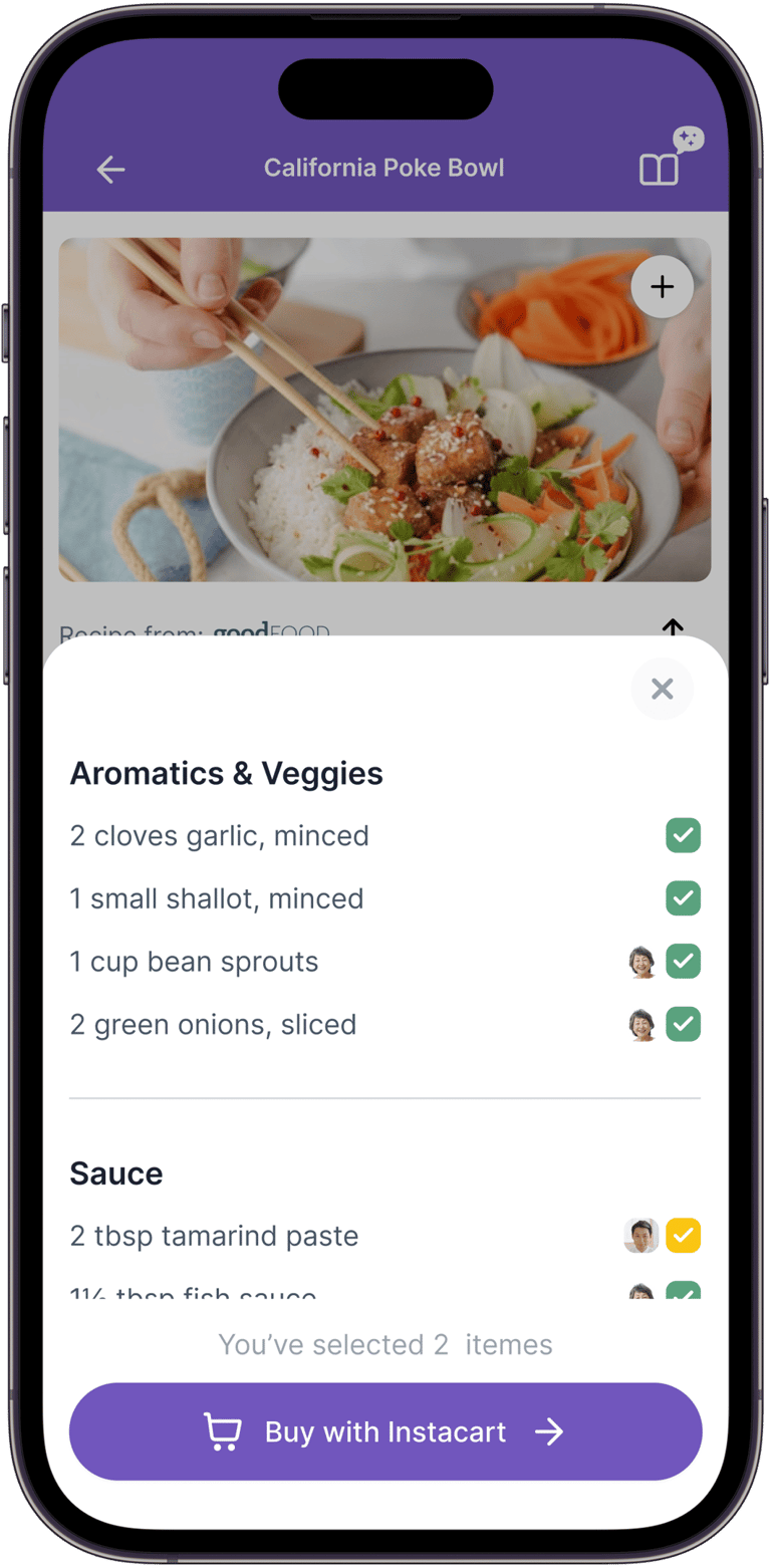 📱 This led to Instacart integration on the recipe page, where family members can view the ingredient list, assign items to each other, and order missing ingredients without leaving the app.