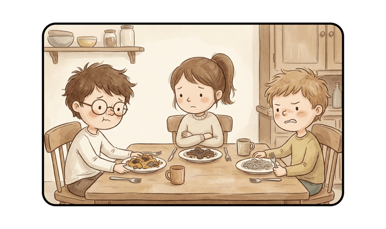 Children sit at the table, frowning at their plates. Every day is a challenge many parents face—picky eaters and different preferences make meal planning a constant balancing act.