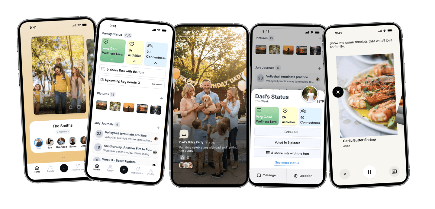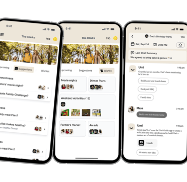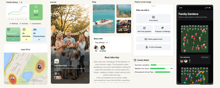 Concepts included Family Garden (visualizing shared activities and progress), Family Wallet (collective financial goals), shared journaling, and early meal planning ideas. These explorations helped us identify what families found emotionally engaging versus what felt like work.