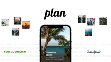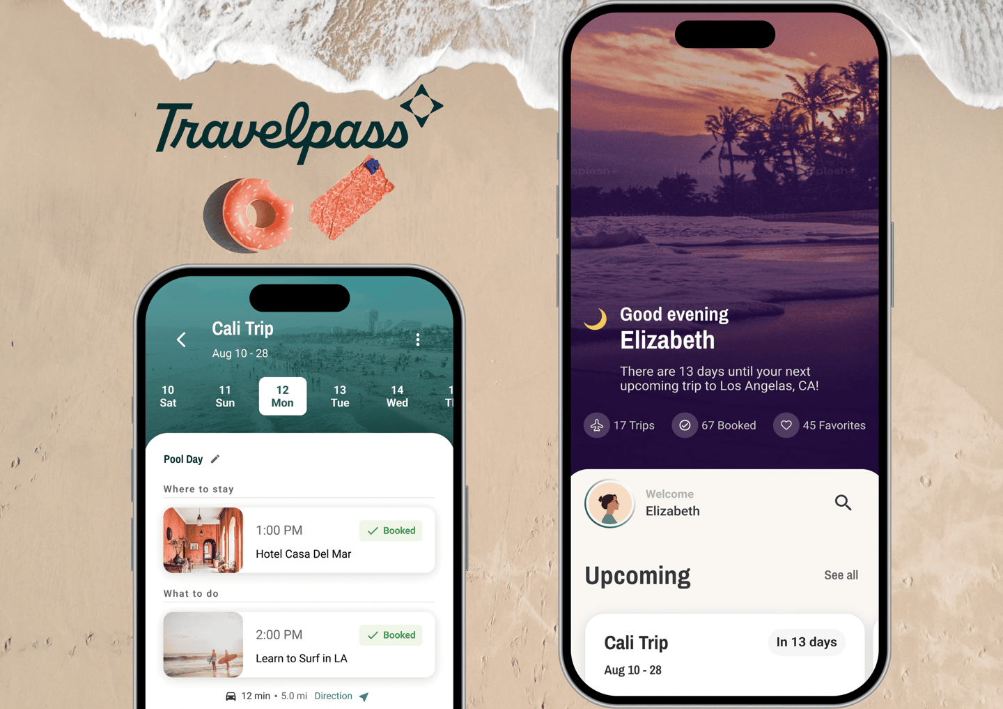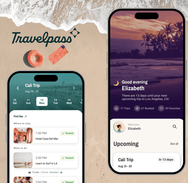 The updated homepage displays city images for upcoming trips, personal trip memos, and booking status. It also suggests hotels and experiences, encouraging users to explore and purchase with Travelpass.