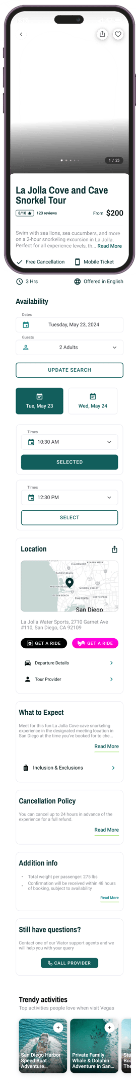 After collecting data (user research)from travel enthusiasts in the office, we found that most people prefer scrolling through all experience info on one page, which contrasts with Viator's approach of using multiple modals before taking users to the check-in page.